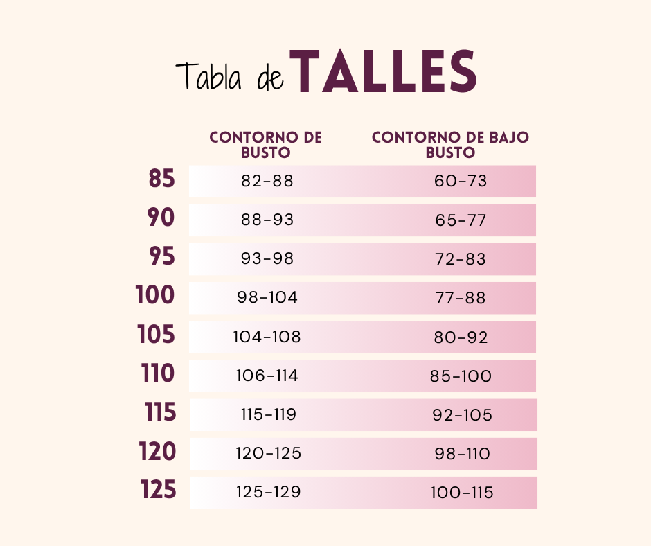 Esta es nuestra tabla de talles. Tené en cuenta, que las medidas con expresadas en centimetros y son orientativas. Si tenes dudas, comunicate con nosotras que te ayudamos a elegir el talle!