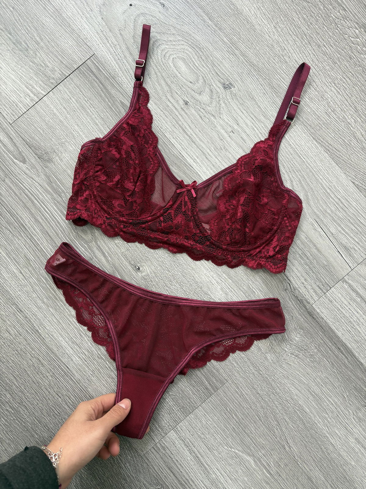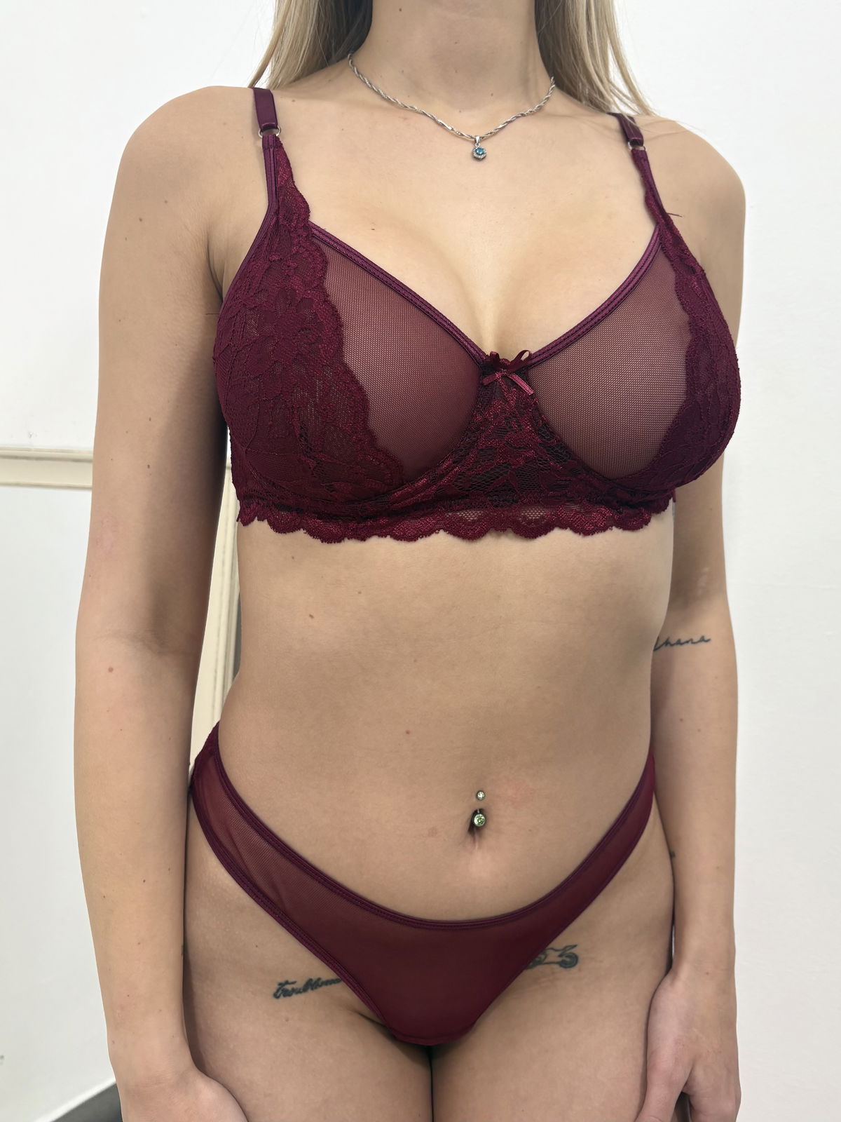 Conjunto de puntilla y microtul. Corpiño con arco entero, y breteles anchos en talles +105. Colaless entera por talle, microtul en la parte delantera y culotteless de puntilla.