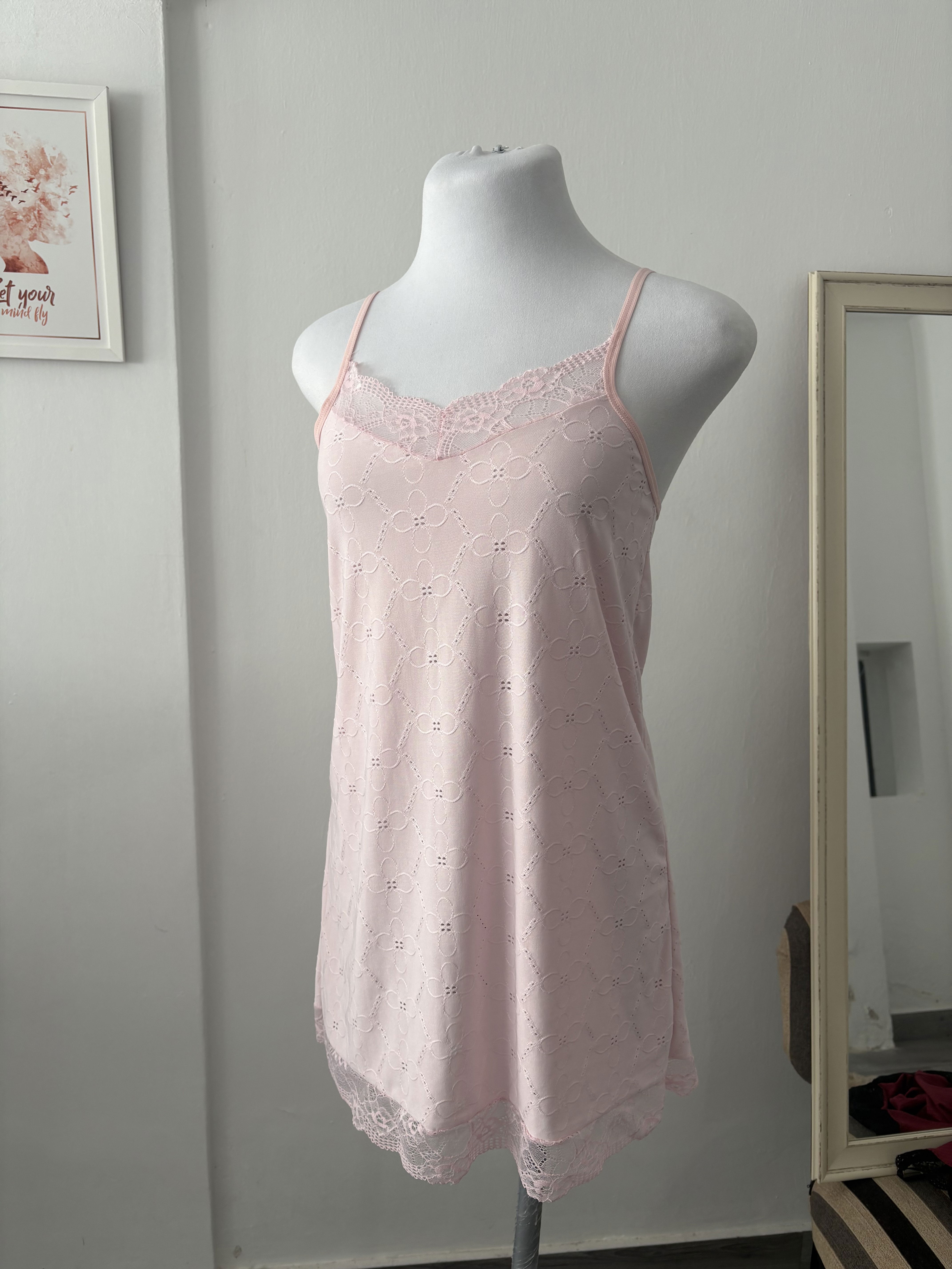 Camisolín hecho en broderie con detalles en puntilla. Breteles con avíos metálicos bañados en plástico a tono.